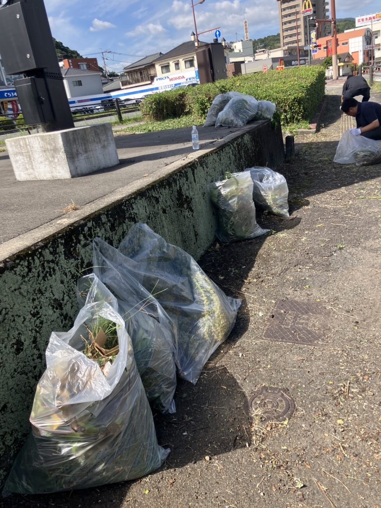 今回の活動場所は、大分市内を走る197号線と40m道路が交差する地点で交通量もかなり多い所なのですが、歩道の雑草がすっかり延びきってしまい歩行の妨げになっていました。