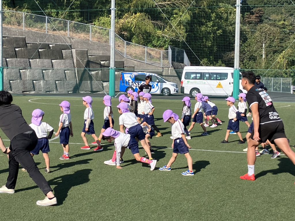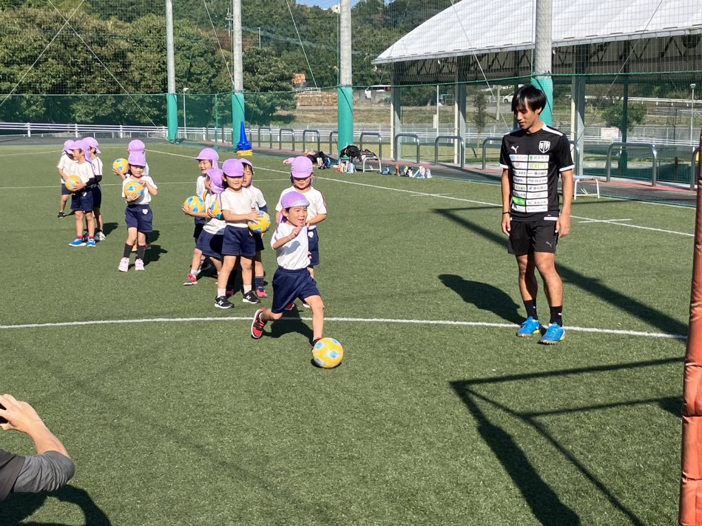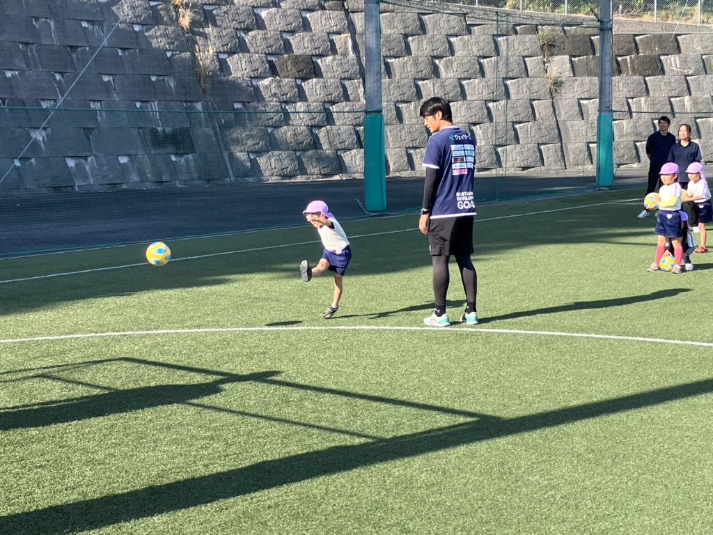 2023年11月1日(水)に、木島悠選手、岩﨑知瑳選手、池田達哉コーチ、大野春佑主務が、大分県速見郡日出町の日出やまとこども園の子ども達を対象にサッカー教室を行いました。