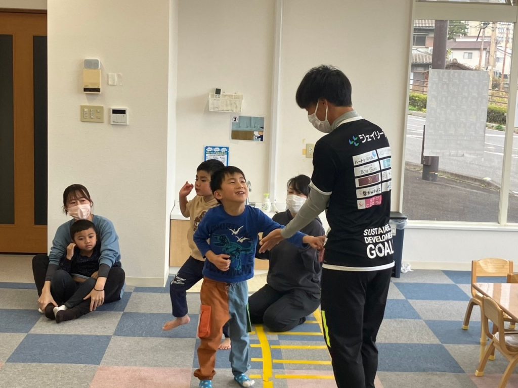 子ども達と元気よく、楽しく過ごす時間はあっという間で、最後にお礼の挨拶をしていると「まだ遊び足りない!」と泣き出す子どもも。