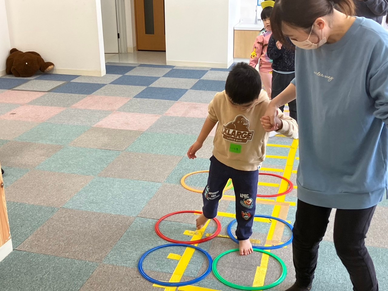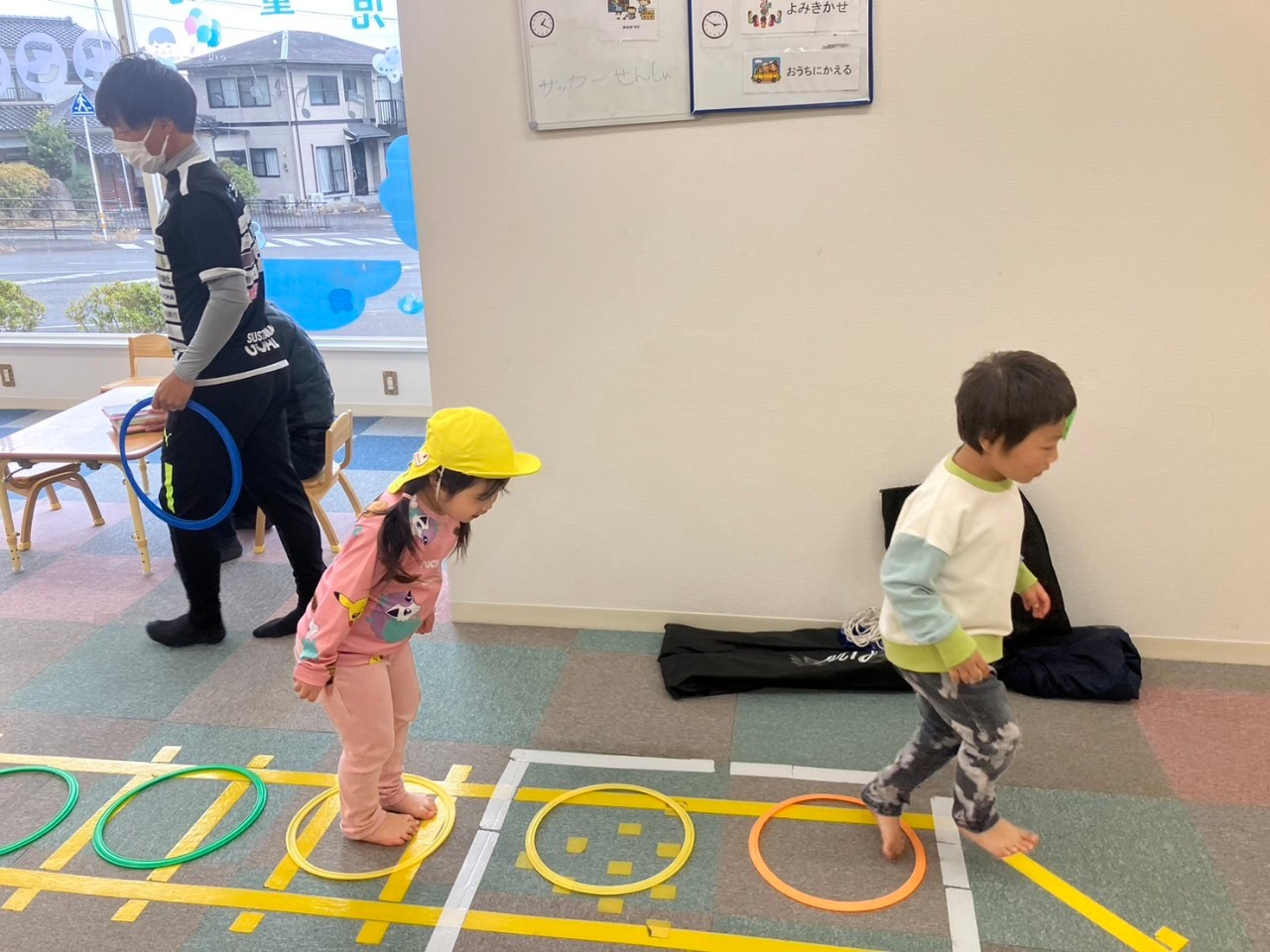 準備体操の後、輪っかの遊具を使った「けんけんぱ」を行ないましたが、元気のよい子ども達は思い思いの動きで「新しいけんけんぱ」を開発。楽しく体を動かしていました。