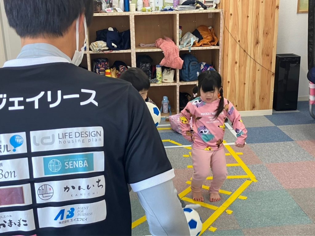 思い思いにボールやミニゴールを使って体を動かす子どももいれば、道具そっちのけで木島選手や池田コーチに遊んでほしい人懐っこい子どももいて、みんなで元気よく動き回りました。