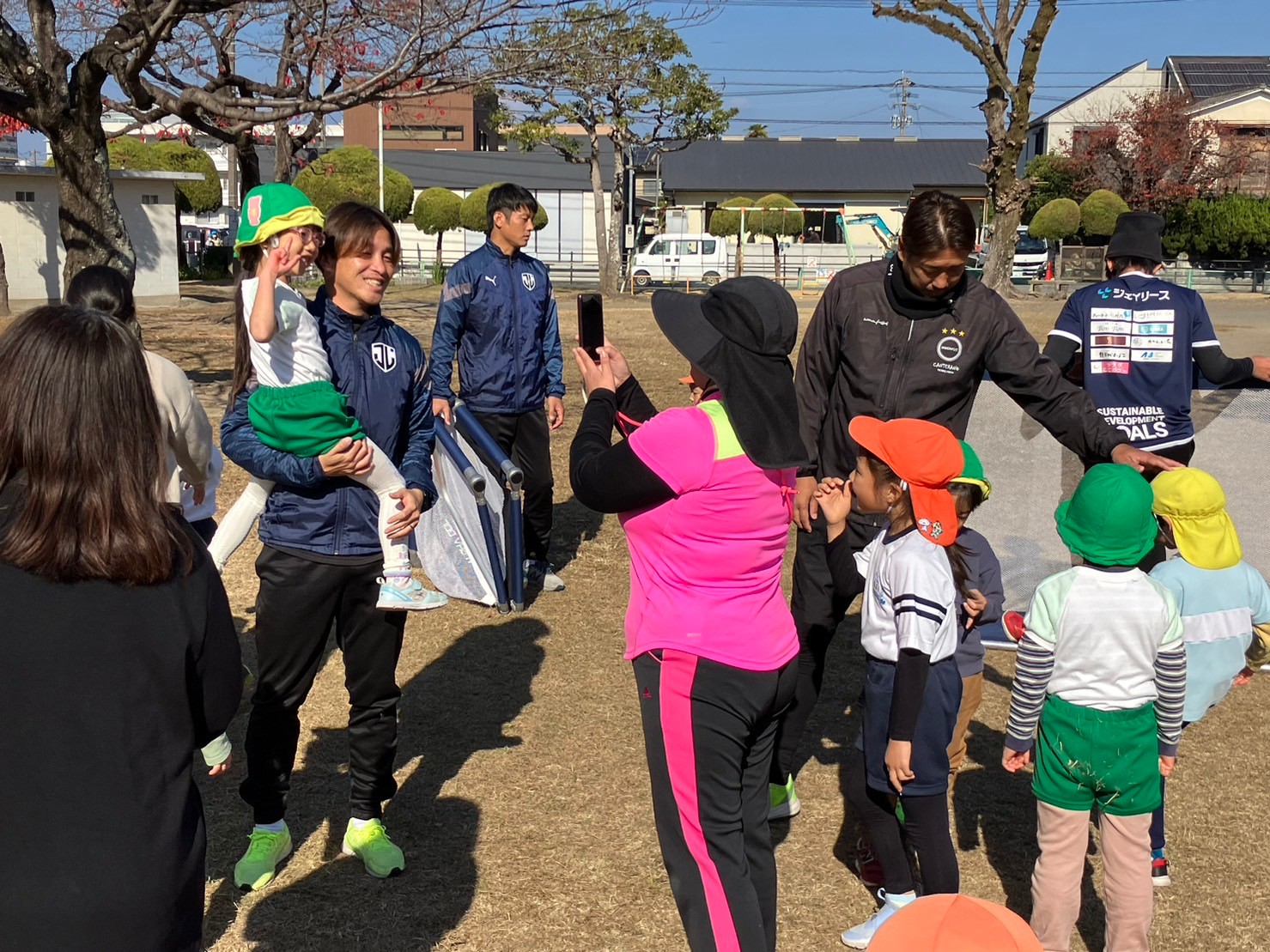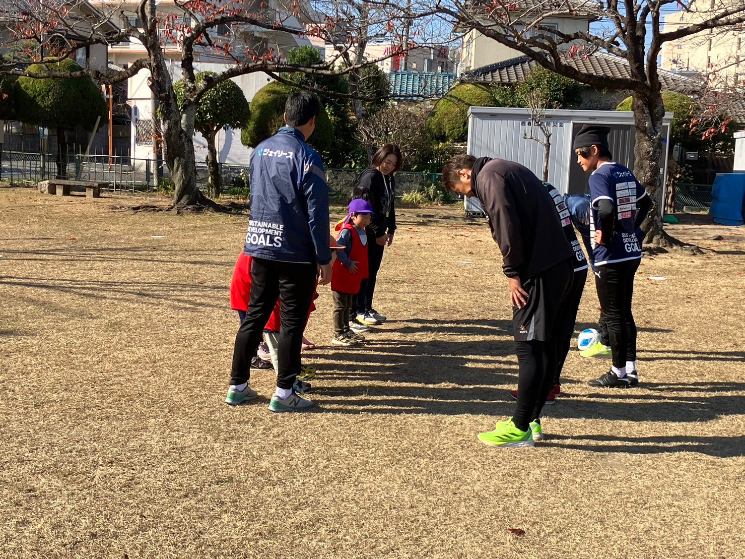 同じ系列の保育園ですが、普段はそれぞれの園で過ごされているとのことで、まずは子ども同士でお互いに挨拶をした後、ジェイリースFCのメンバーと挨拶。