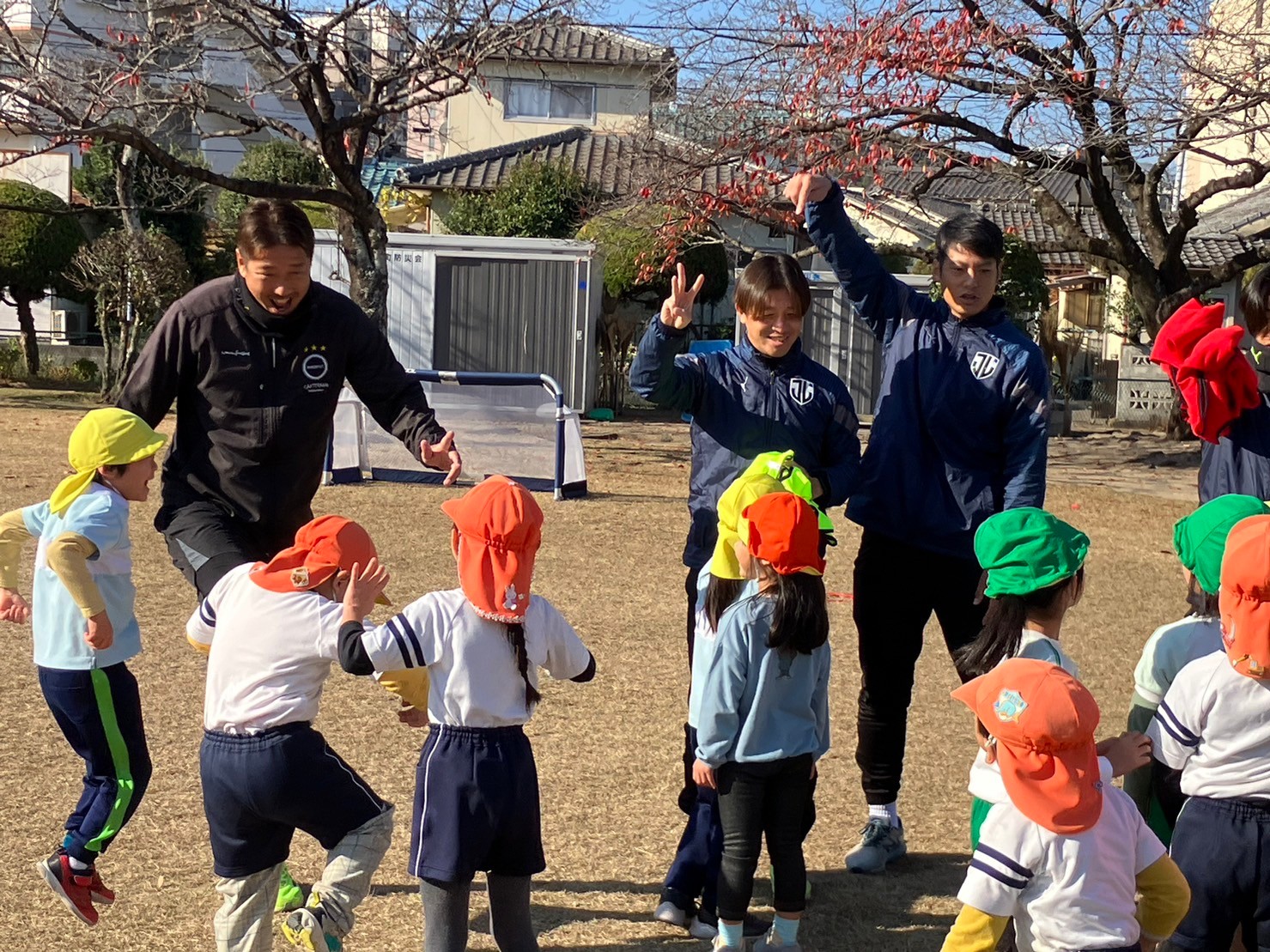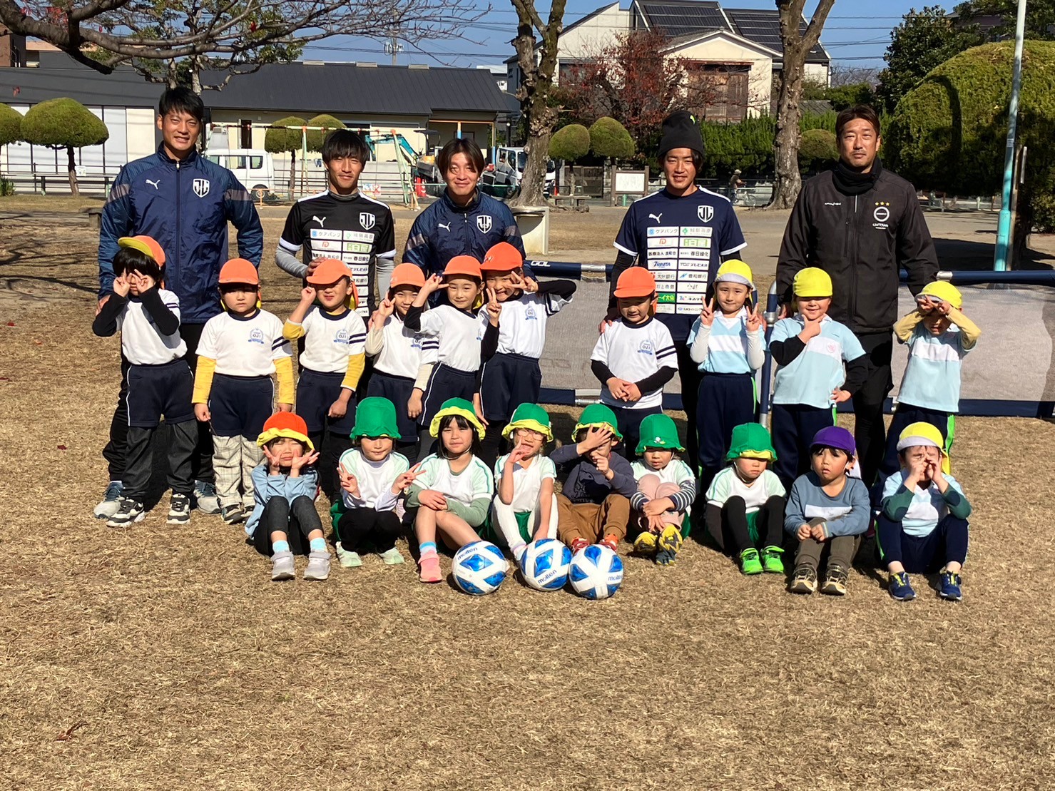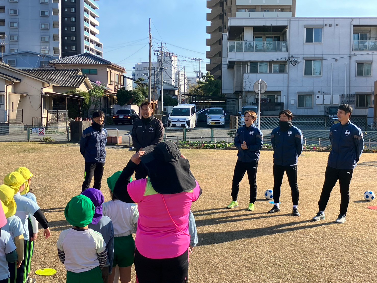 2023年12月4日(月)に、八反田康平選手、木島悠選手、高松大樹CRO、池田達哉コーチ、大野春佑主務が、大分市の「マジカルガーデン」、「王子町保育園」、「第二王子町保育園」の子ども達を対象にサッカー教室を行いました。