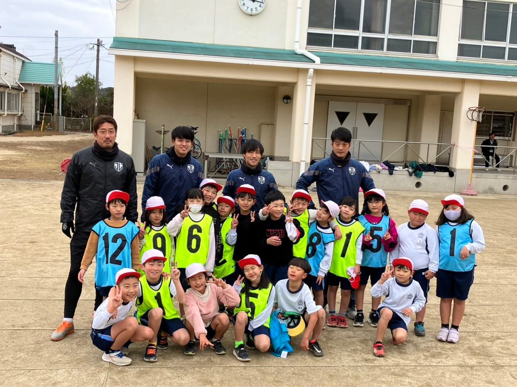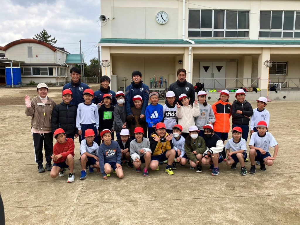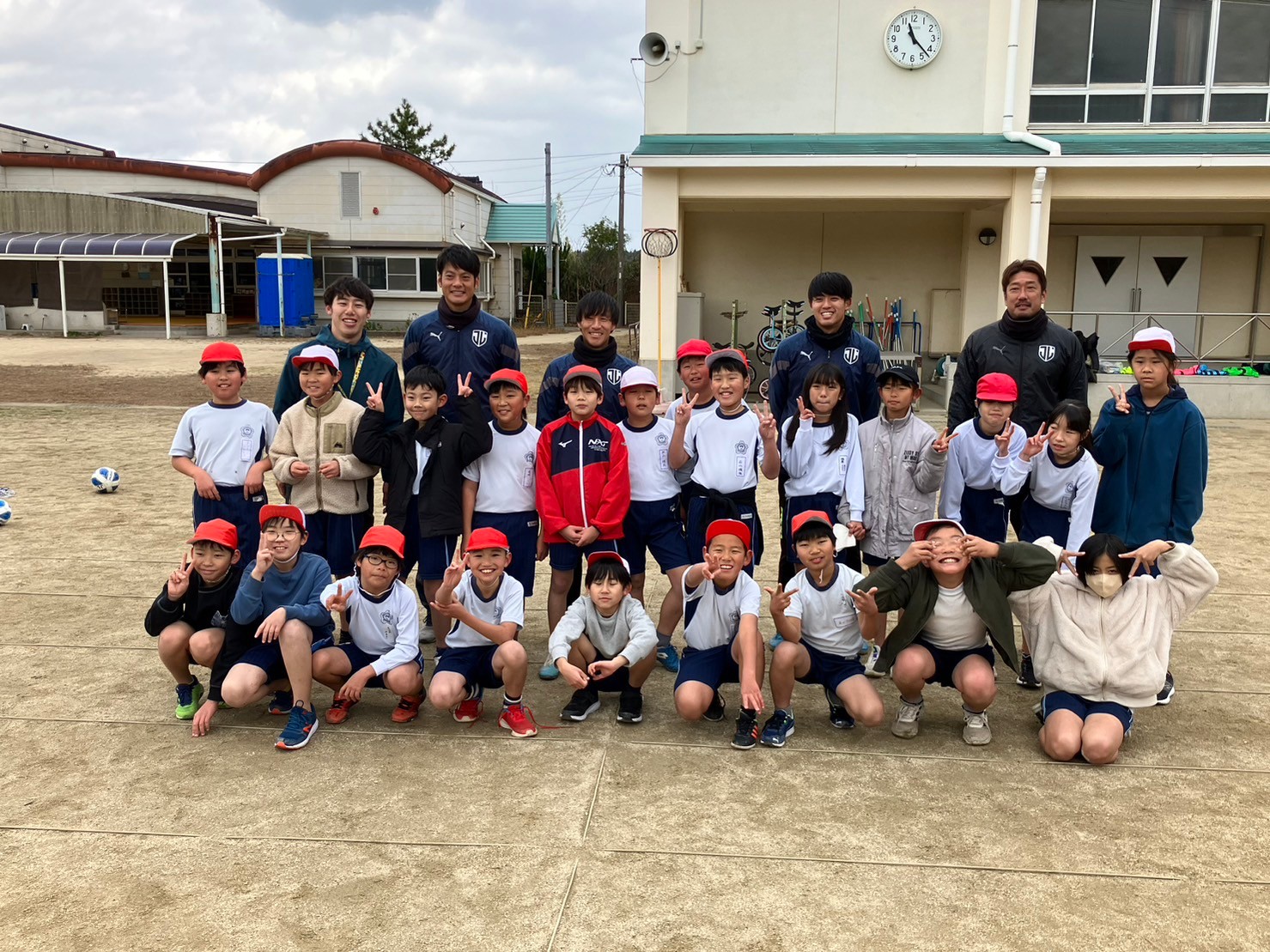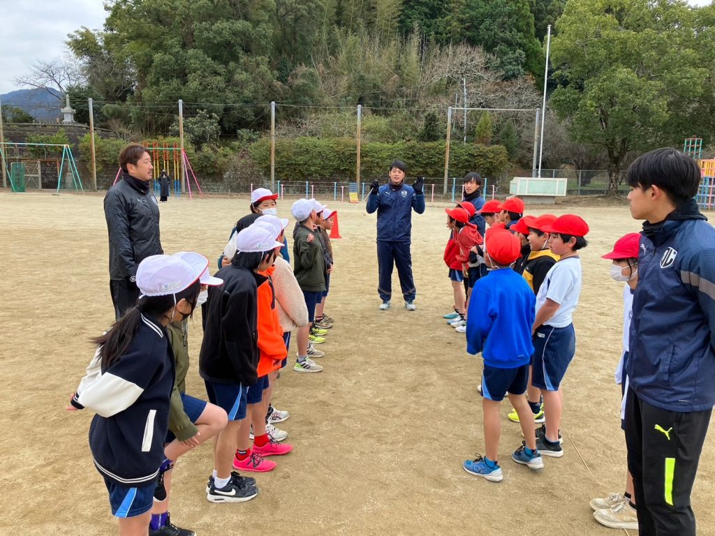 12月18日(月)に木島悠選手、佐藤昂洋選手、池田達哉コーチ、そして高松大樹CROの4名が、大分市立丹生小学校で実施されている「DREAM project」にお招きいただき、サッカー教室を開催しました。
