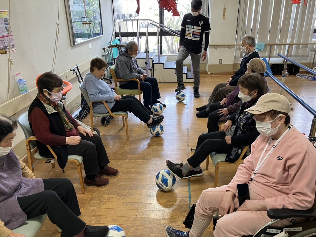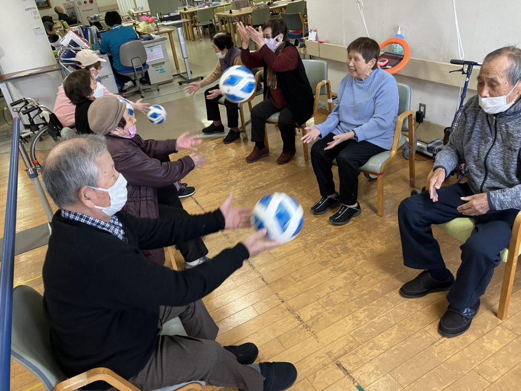 今回は、利用者の皆さんと体操、座ってパス交換、立ってパス交換を行いました。