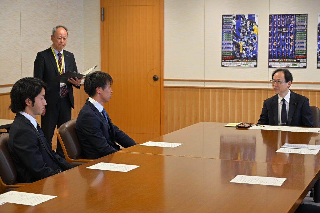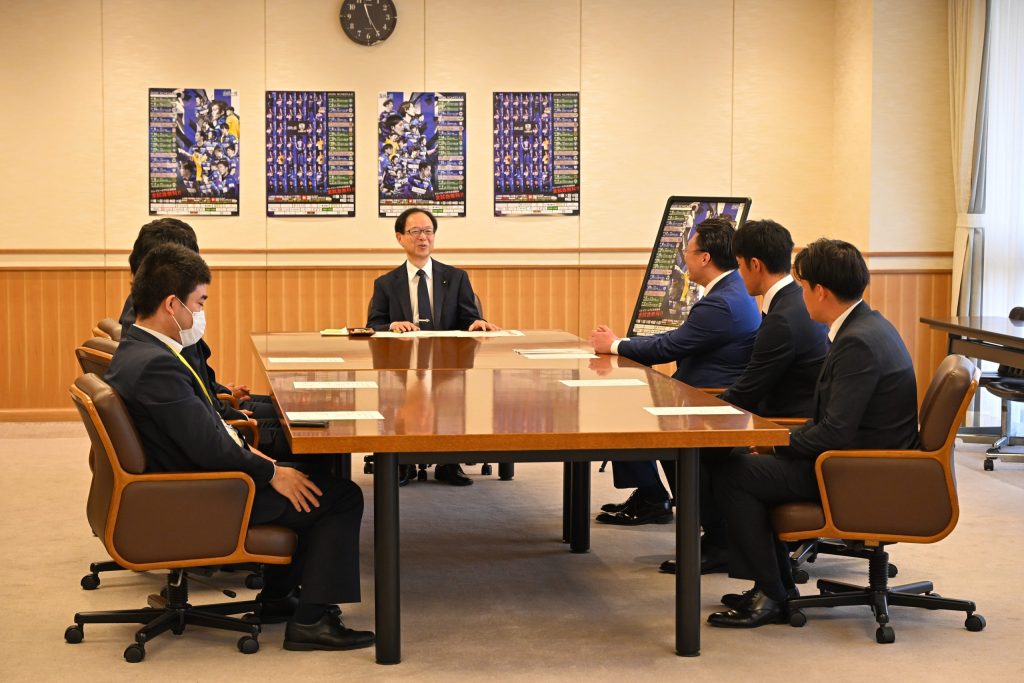 本日、ジェイリース株式会社 中島土代表取締役社長、柳川雅樹監督、永芳卓磨GM、薗田卓馬選手、田中純平選手が佐藤樹一郎大分県知事を表敬訪問しました。