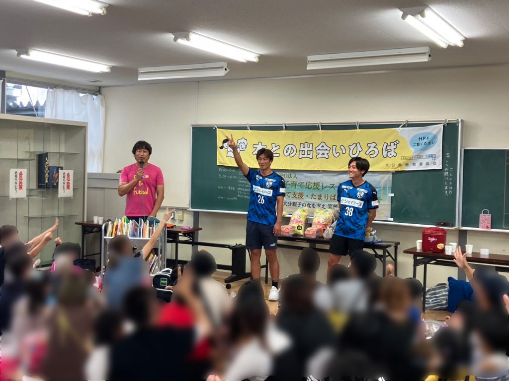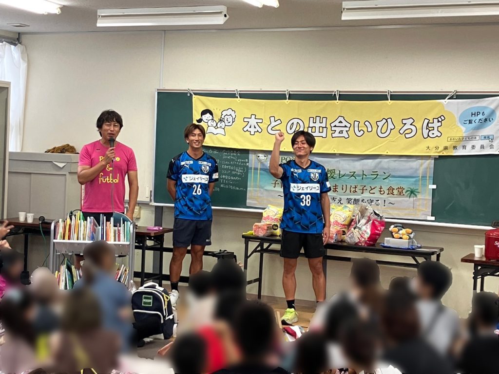 「大分HAPPY子育て支援」が8月27日(日)に大分市立大東中学校にて行われ、ジェイリースFCから宮地裕二郎選手と佐保昂兵衛選手が参加しました。