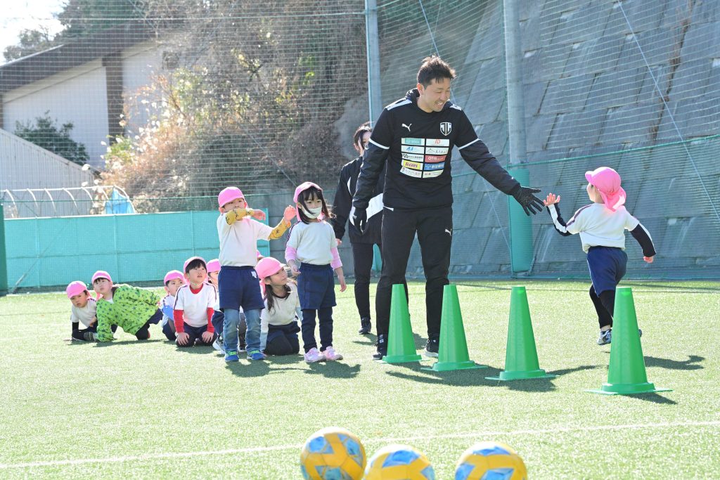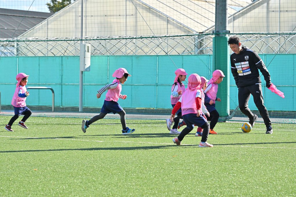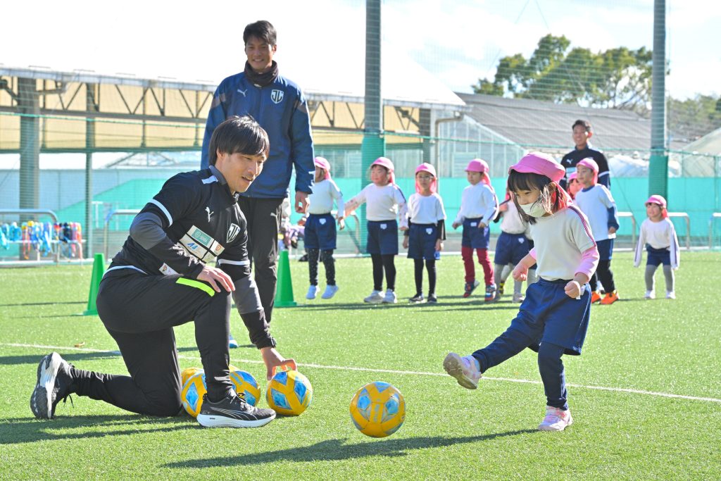 2025年1月28日(火)に木島悠選手、永松恭聖選手、岩﨑知瑳選手、西田恵選手、池田達哉コーチが日出やまとこども園の子ども達を対象にサッカー教室を行いました。