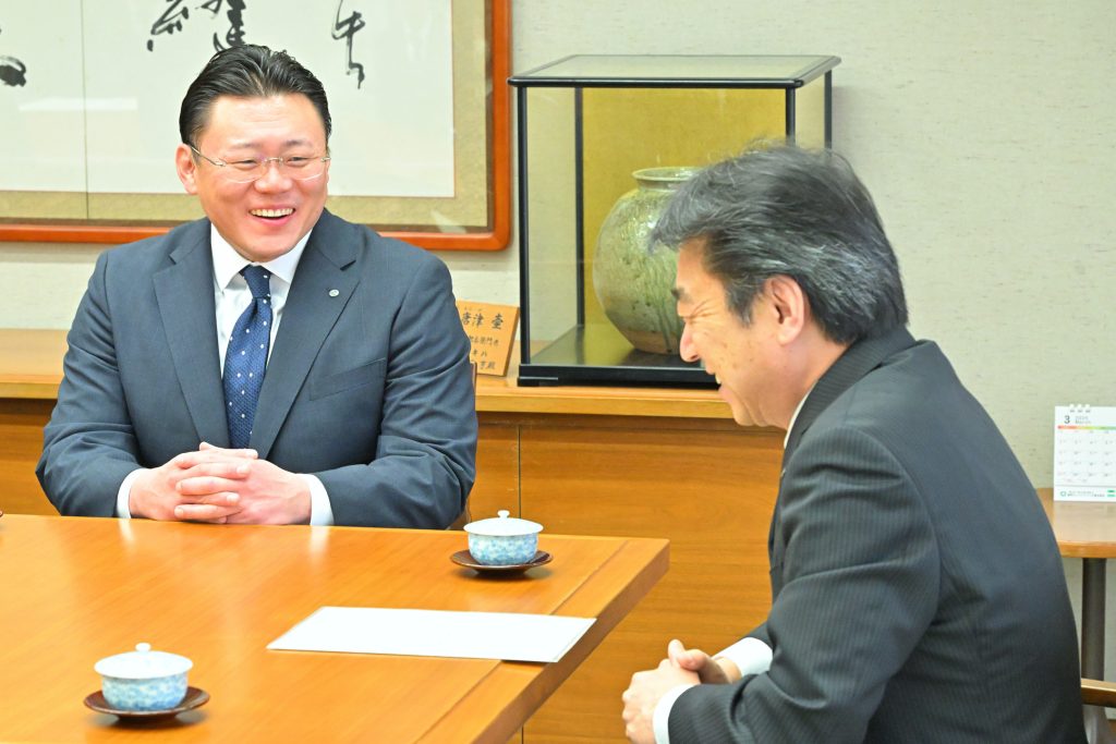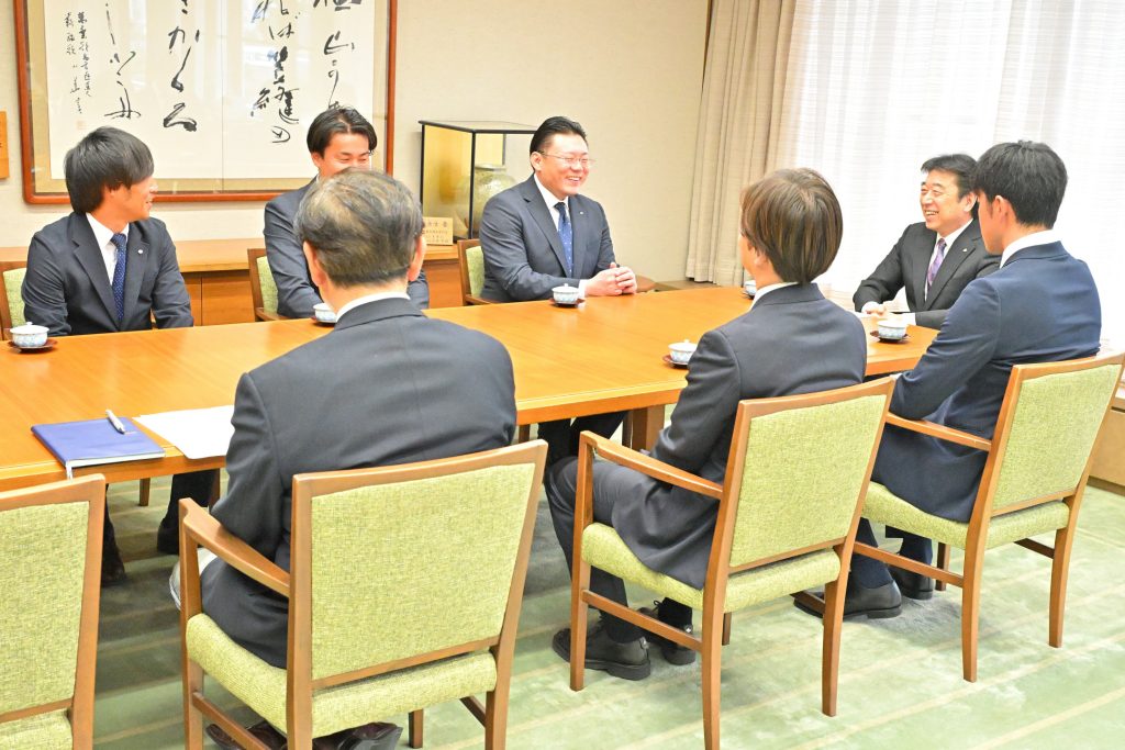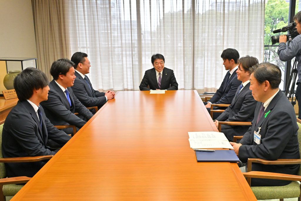 九州リーグ開幕を前に ジェイリース株式会社 中島土代表取締役社長、柳川雅樹監督、永芳卓磨GM、八反田康平キャプテン、木島悠選手が足立信也大分市長を表敬訪問しました。