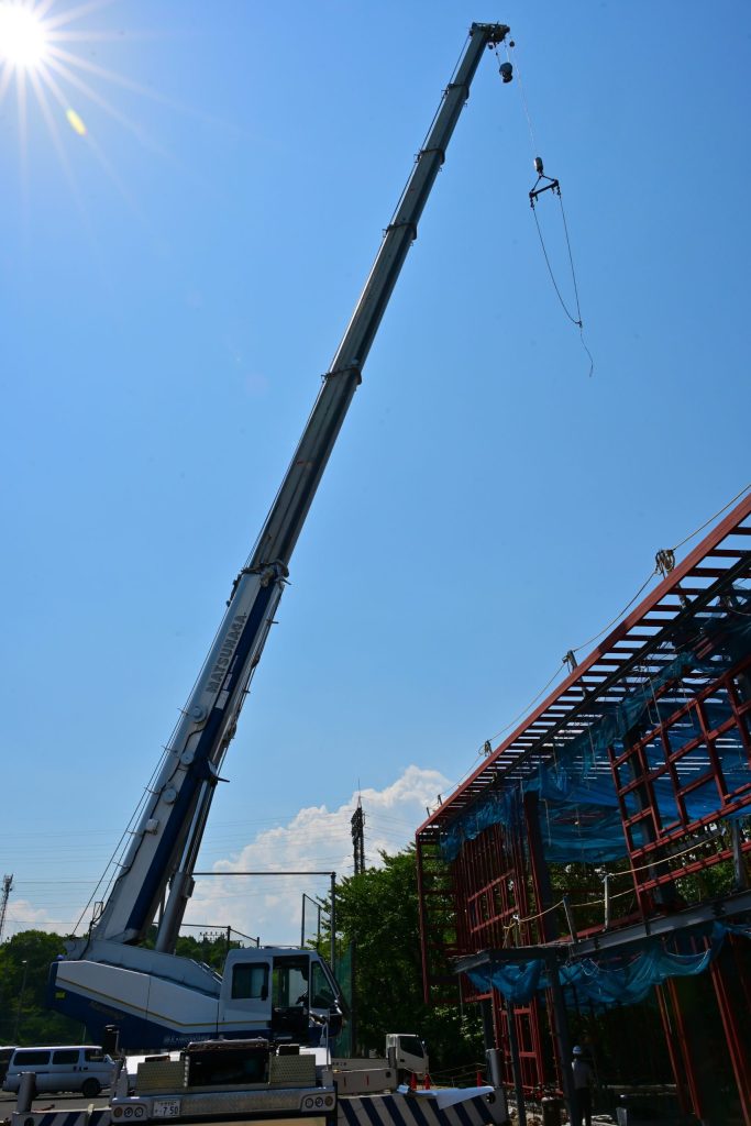 このクレーンを使用し、鉄骨を運び組んでいきます。
