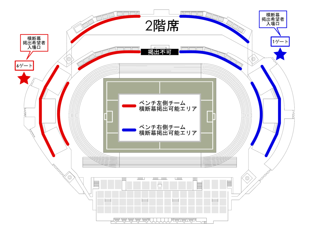 ・横断幕の掲出可能エリアは、バックスタンドならびにゴール裏の指定場所(下図参照)のみです。メインスタンドへの掲出は禁止です。