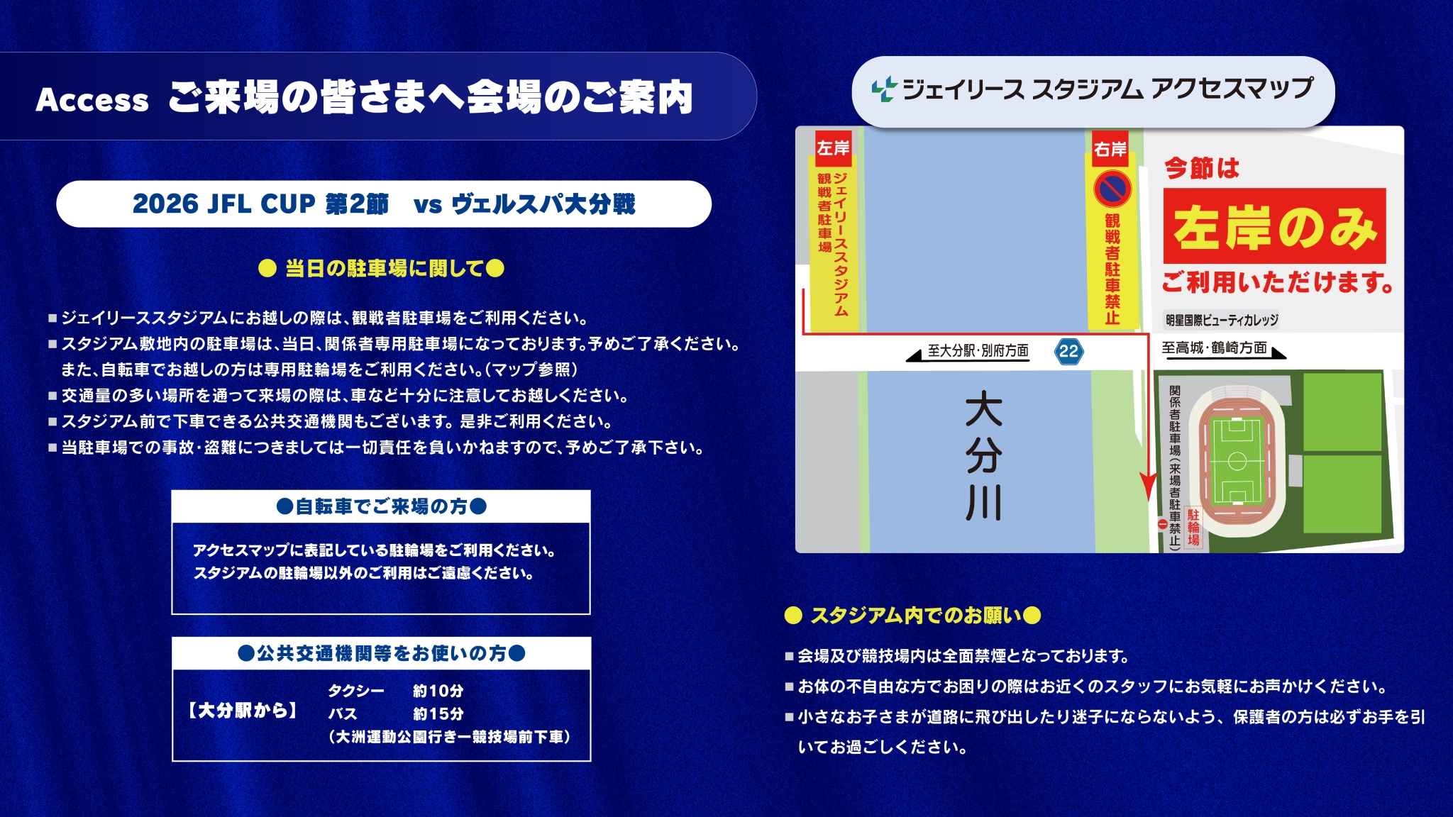 今節の観戦者駐車場は、左岸のみとなっております。駐輪場はアクセスマップに表記しているスタジアムの駐輪場以外のご利用はご遠慮ください。