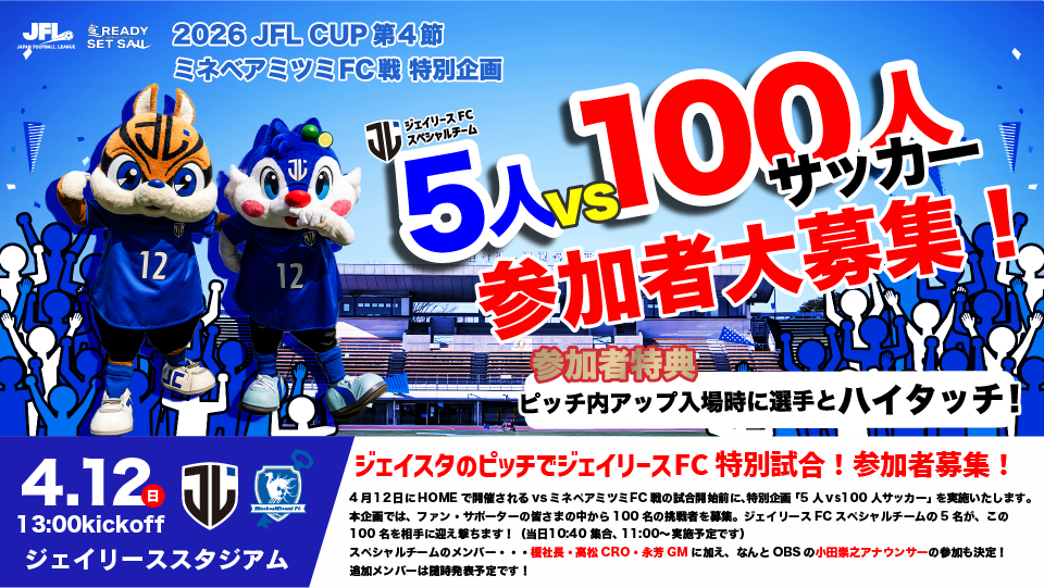 本企画では、ファン・サポーターの皆さまの中から100名の挑戦者を募集。ジェイリースFC スペシャルチームの5名が、この100名を相手に迎え撃ちます。