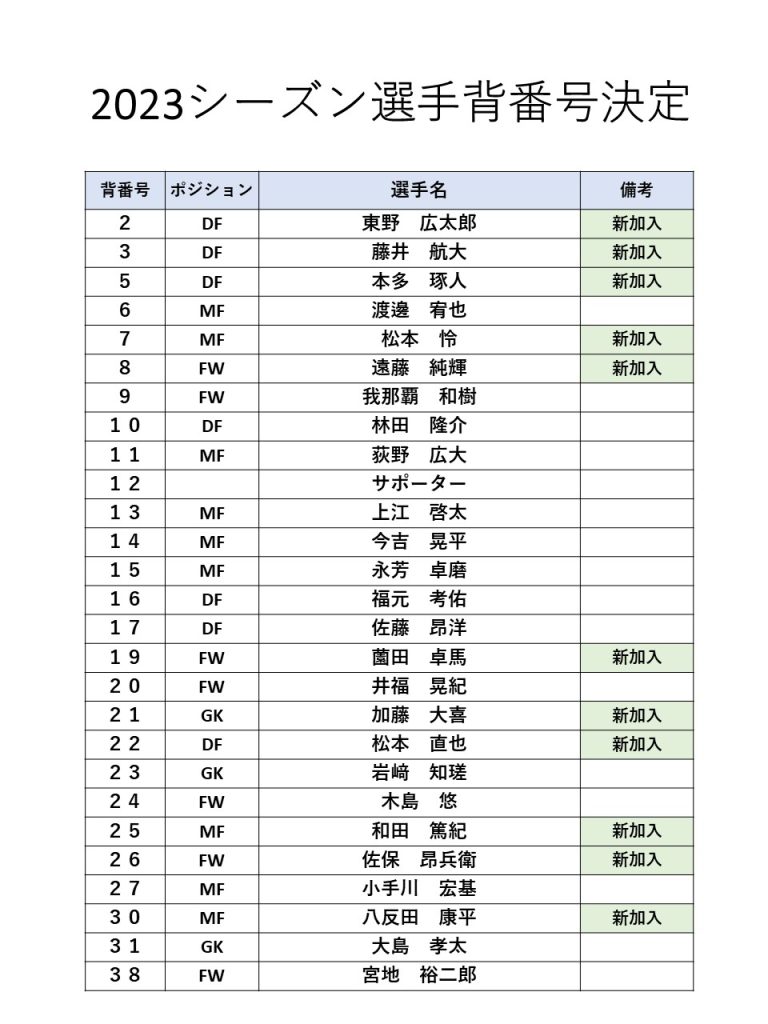 この度、2023シーズンの選手背番号が決定しましたので、お知らせいたします。