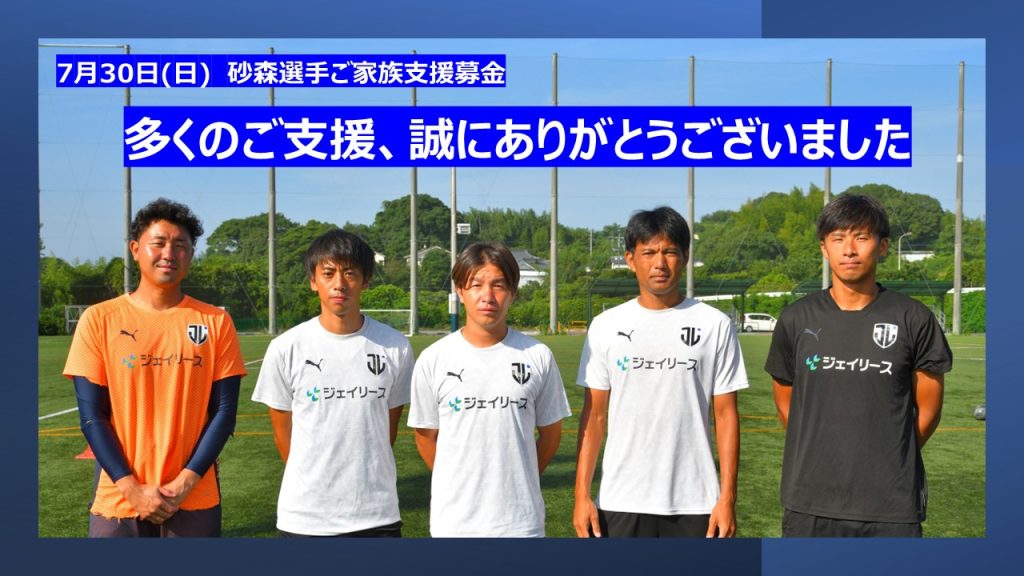 砂森選手のご息女の早期回復をジェイリースFC選手・スタッフならびにサポーター一同、心よりお祈り申し上げます。