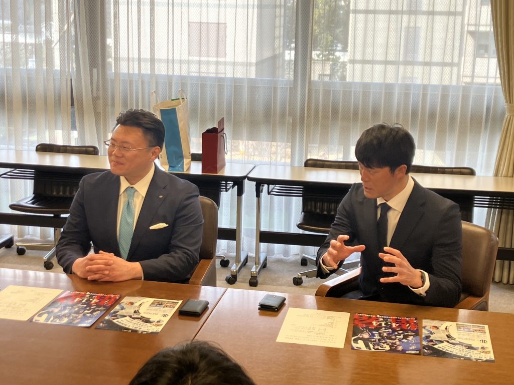 中島社長よりジェイリースFCの地域貢献活動について、そして柳川監督より今シーズンの目標や抱負などをお話させていただき、佐藤知事からは九州リーグやJFL昇格までの道のりについて幾つかのご質問をいただくなど、大変興味深く聞いていただくことが出来ました。