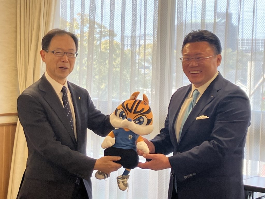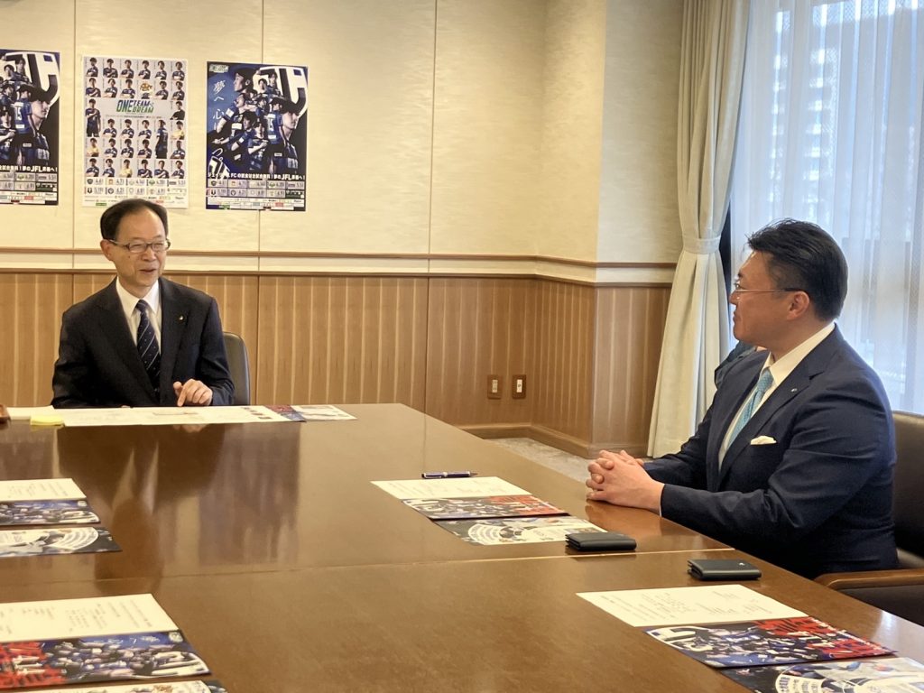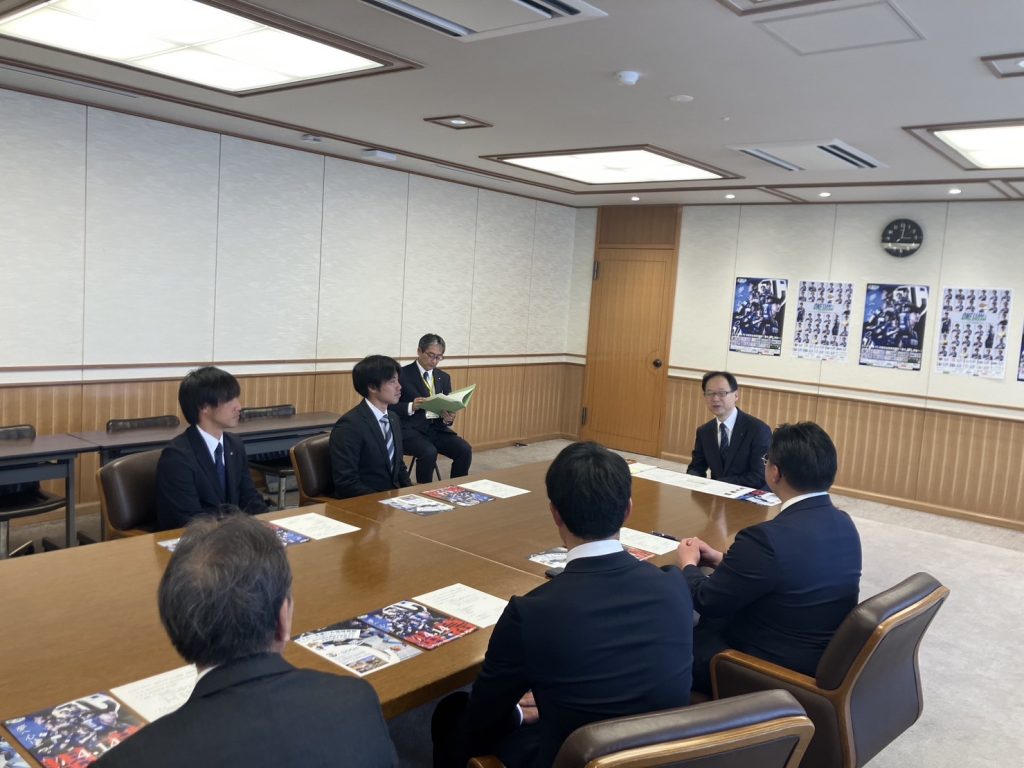 本日、ジェイリース株式会社 中島土取締役社長、ジェイリースFC 柳川雅樹監督、今吉晃平キャプテン、木島悠選手、榎徹FC運営部長が、