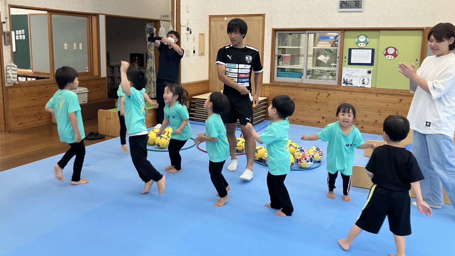 7月1日(月)に木島悠選手、高松大樹CROの2名で、ありのみ保育園を訪問しました。あいにくの雨模様だったため、今回は屋内で思いっきり遊びました!