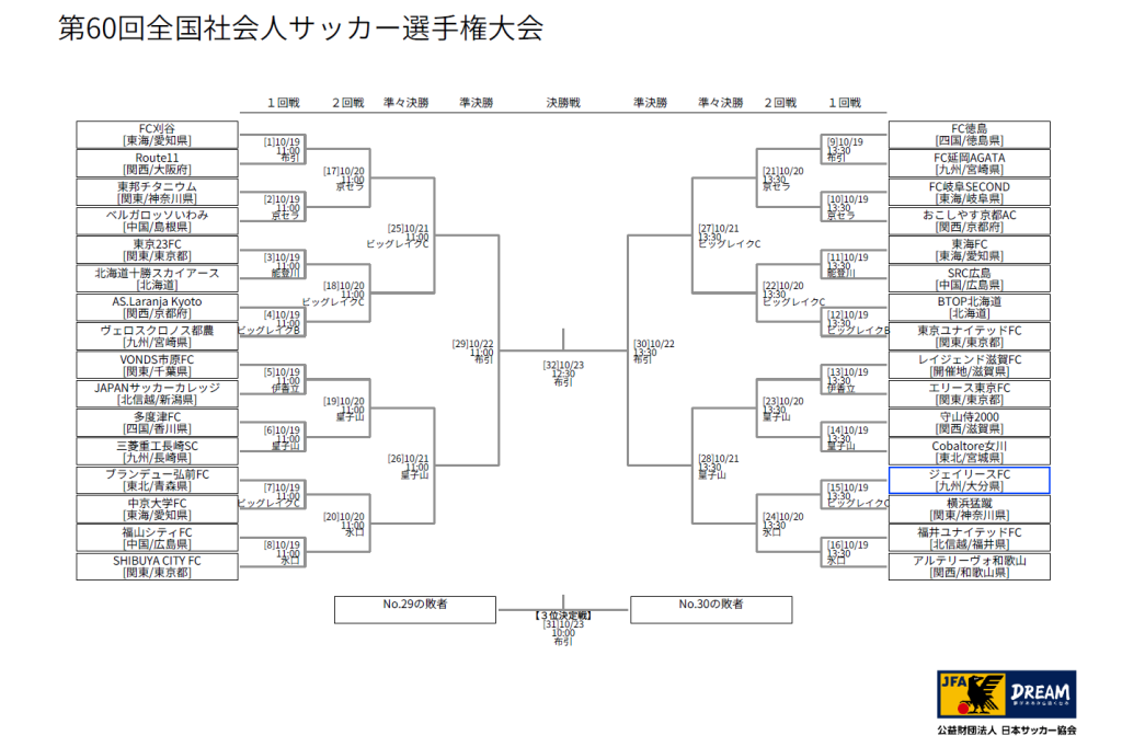 1回戦以降の組み合わせ、試合日程は日本サッカー協会公式HP第60回全国社会人サッカー選手権大会をご覧ください。