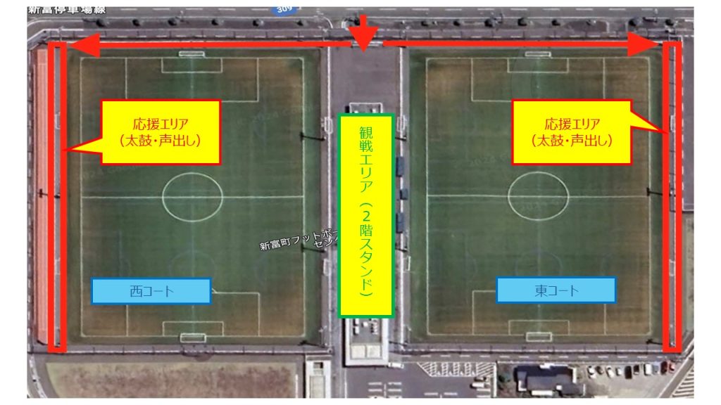 ・太鼓などを使用しての声出し応援はピッチ脇のエリアにてお願いします。