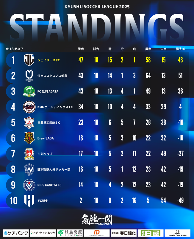 第52回九州サッカーリーグ全日程終了順位表
